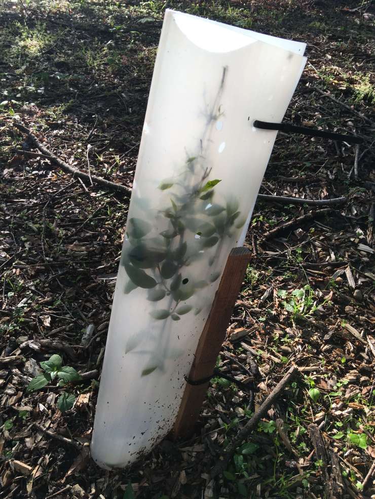 May 13, 2919 — As I walk to the Metro during these spring mornings, I’m delighted to see baby trees sprouting in plastic casings. Last fall, Arlington County planted scores of trees on either side of the stream that hugs my path. As I peer through the white plastic tree-guards, I see that about half of the new prospects survived the winter and are flourishing. Sprouting leaves and inches, they push to join the trees towering over them. Some day. But in the meantime, their youthful energy makes me smile.