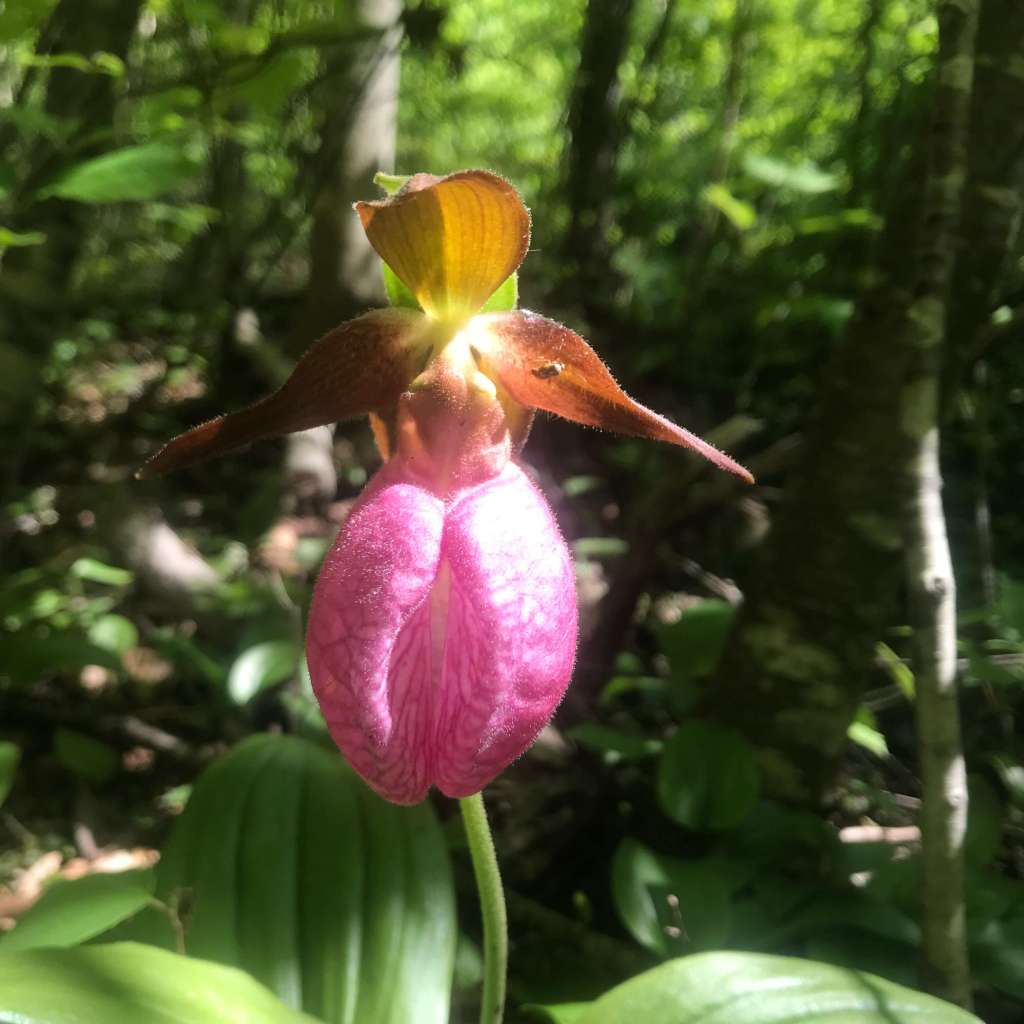 May 20, 2019: A friend told me a story redolent of cloak-and-dagger, all to glimpse an exotic Blue Ridge wildflower. In search of a pink Lady Slipper, which he knew to be in bloom in May, my friend took one of his weekend hikes in Shenandoah National Park. He asked a park ranger where he’d find this beautiful and rare orchid. Rather than point “thataway,” the ranger directed him to a nearby visitors center. The ranger there looked him in the eye and fired up the grill: “Who are you? Where are you from? What’s your purpose?” And more. My friend apparently passed muster and was directed to a particular trail head. Hike, hike hike. Miles later, my friend encountered another ranger and another set of questions. Finally, that ranger relented and revealed the secret location. Although orchid thieving is serious business — thank you, park rangers! — my friend’s story made me laugh. And now we can see what he saw. Such beauty!