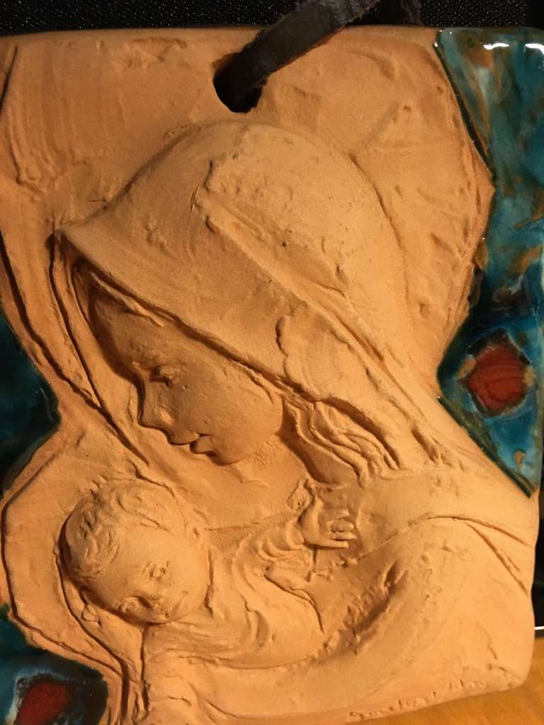 Maybe that’s why decades later, on September 11, 2001, in the corner of my own dining room I placed a small glass cup, ribbed and gilded, and a small squat candle, burning bravely, next to a palm-sized ceramic panel of the Madonna and Child I’d pulled from a drawer.