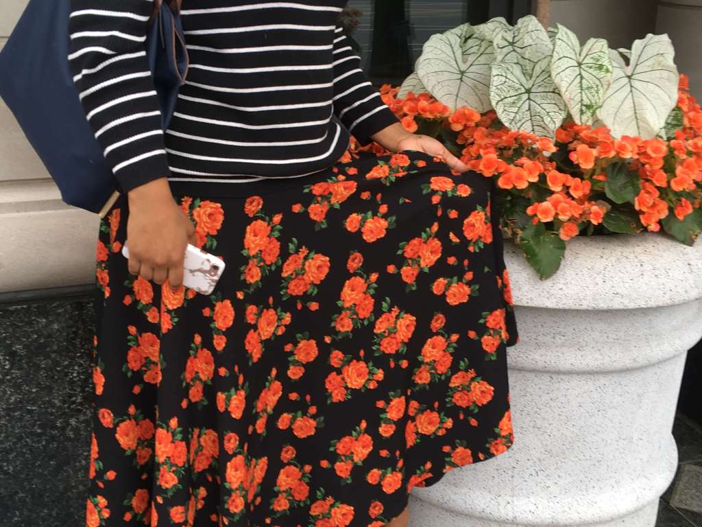 June 17, 2019: As I admired a large pot of rose-like orange begonias and luscious white caladium, a young woman walked by. Her skirt swung with clusters of orange flowers, exactly the shade and size of the begonias beside her. Oh ho, this would be my delight! I scampered back to the woman, who lingered a few dozen yards away and interrupted her. I have a blog, I said. I post daily delights, and today when I saw your skirt next to those flowers…. Would you let me take a picture? Oh, yes, she said. I hadn’t even noticed! As we parted, I thanked her: your kindness, I said, was my second delight.