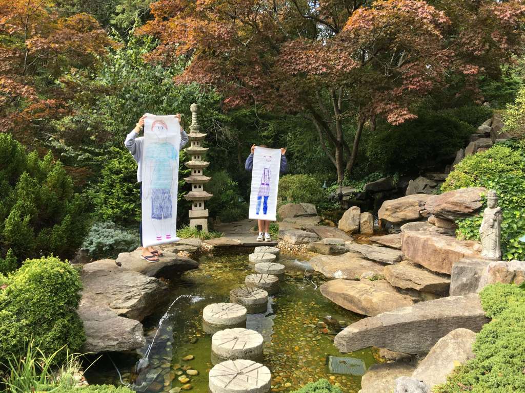 October 12: Naturally, I leaned across the backseat and buckled them in. We were on our way to Hillwood, a mansion transformed with ornament and garden into a work of art. Maybe heads turned as we drove down Connecticut Avenue: a mom in the front seat and two flat paper children in the back. I brought pins and tape to stage my photos, but all I needed were sweet teenagers who happily crouched behind chairs or balanced on rocks to hold Flat Liam and Flat Ava. I hope my flat friends had fun: the rest of us certainly did!