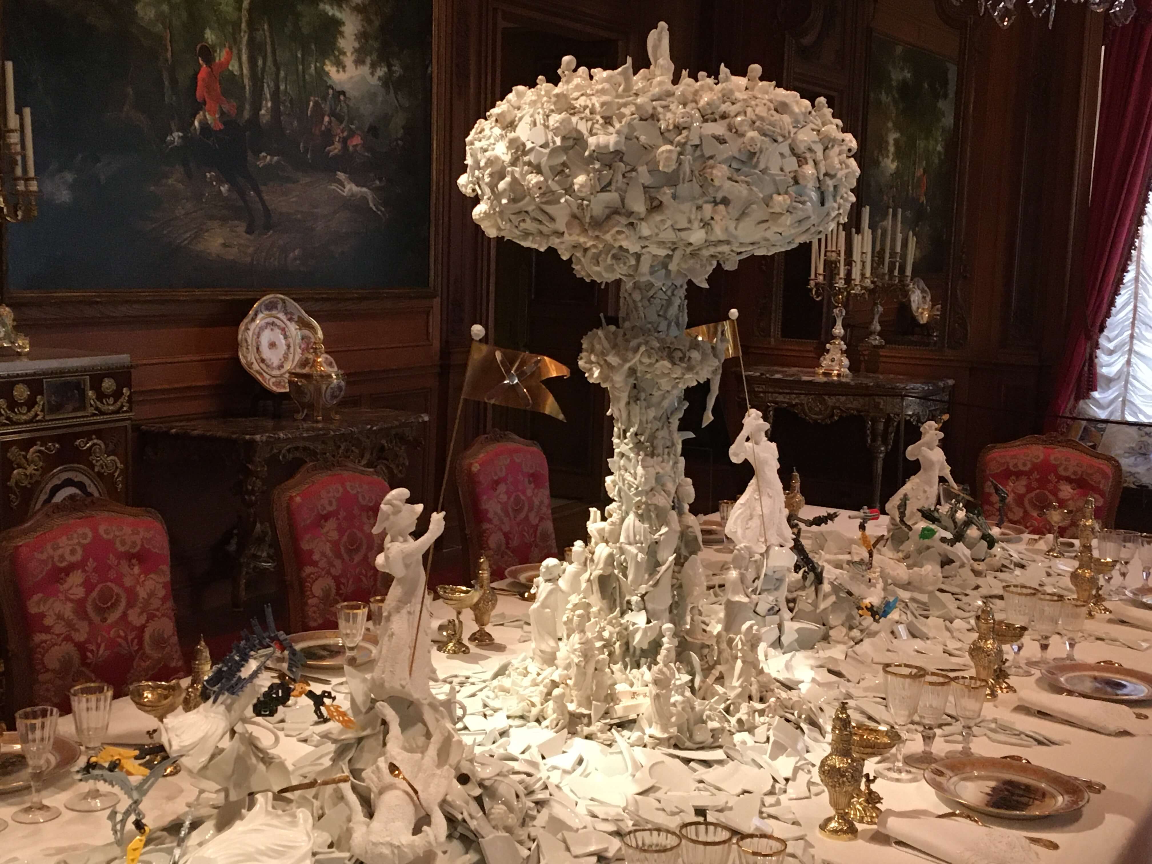 October 13: Here are a few more delights from Hillwood Estate Museum and Garden. Wandering at my own pace (Flat Liam and Flat Ava were very obliging), I lingered over the fabulous displays of sacred and decorative arts and the mid-century photographs of Albert Eisenstaedt. But the highlight was a remarkable installation called War and Pieces. By the Dutch artist Bouke de Vries. the work features a four-foot mushroom cloud composed entirely of icy white porcelain shards, heads and figurines planted amid icy-white angels and demons. These figures, in turn, rested on pottery fragments, and the whole arrangement sat among the lace, crystal, silver and china of a heiress’ dinner table. Add Bionicle claws and swords, and I was transfixed.