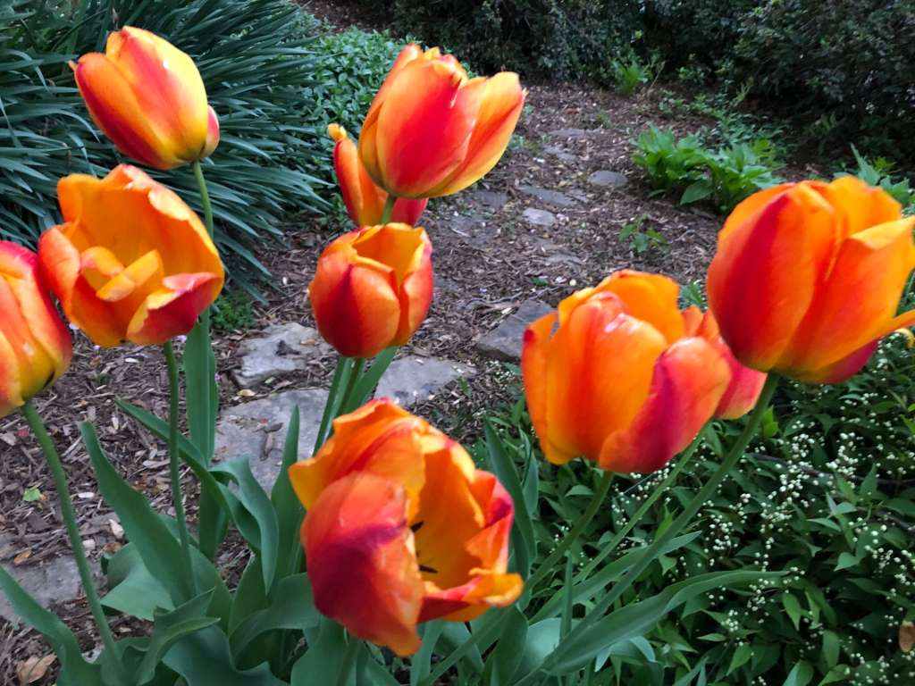 April 12: I was in the car, bound for bagels. But evidently I had other treats in mind. Along our main road, I saw tulips like snowy white cupcakes with tips of tufted cherry frosting. I saw tulips like candy canes swirled with buttery white. I saw red and yellow tulips with their petals bowed plumply outward that looked, just briefly, like a clutch of lollipops. And the purple-black tulips reminded me of fudge. White dogwoods reached over all of them like the paper lid of the confectioner’s box. I’ll take two please.