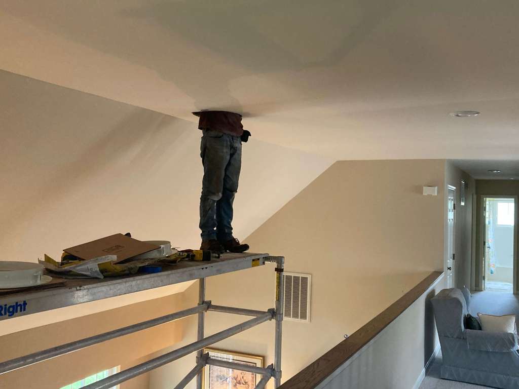 April 14: In our house we now have bright sunshine where dimness had been. From his upstairs room, Jeremiah heard the banging and sawing of “sun tunnel” installation. But, he said, he wasn’t quite prepared for the sight of the workman himself. Half of him, anyway.