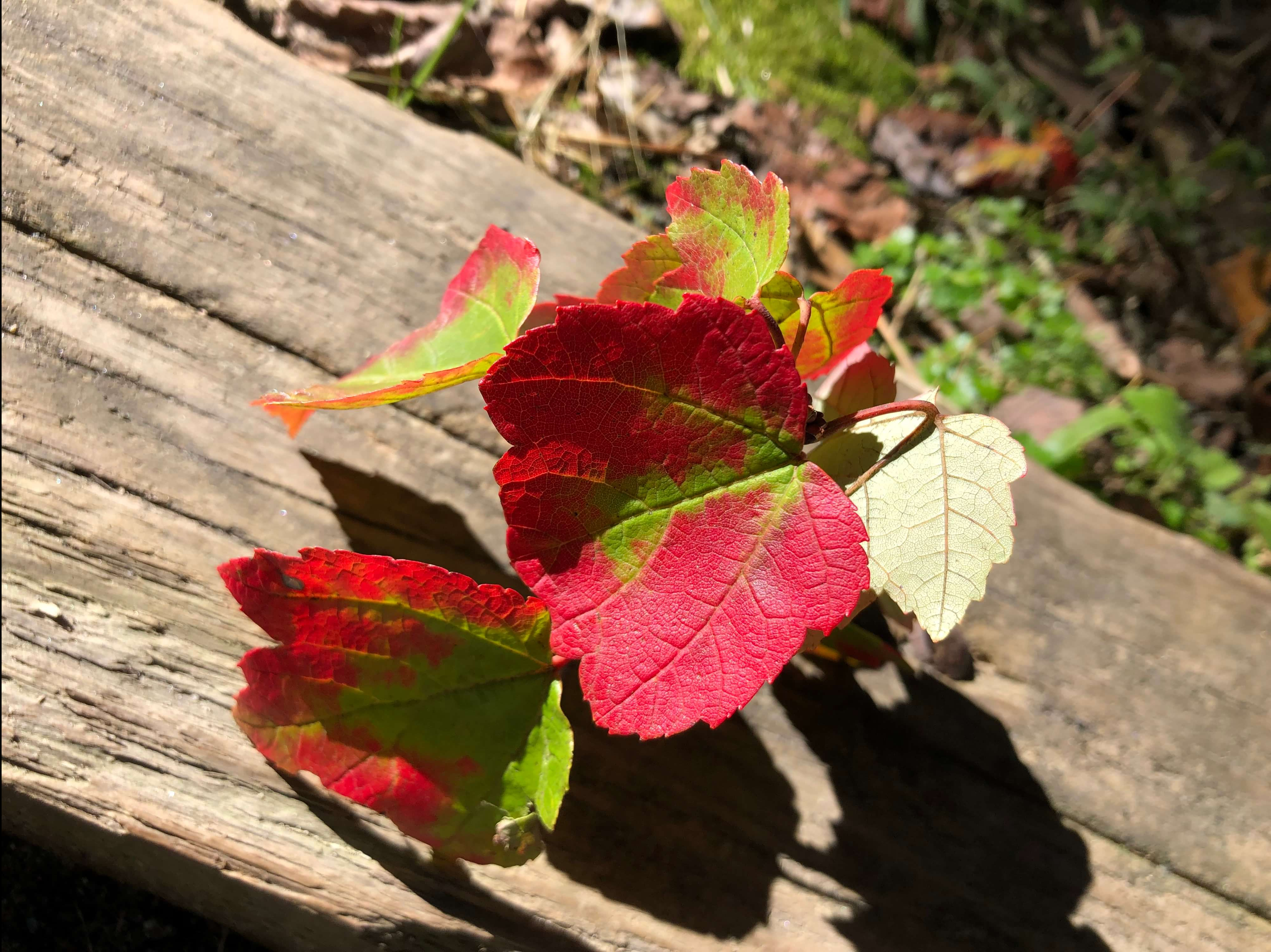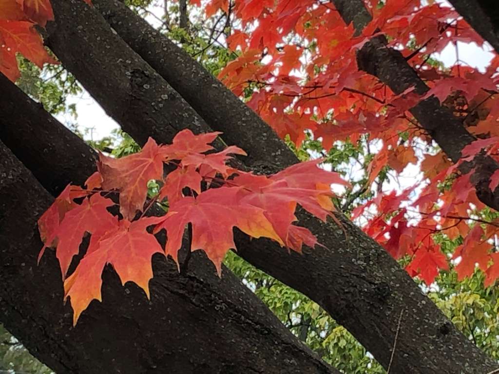 October 26: A mom maneuvered her double stroller onto my side of the walking path. She bent down and plucked something red from the grass. Pushing back the canopy shading her long-legged daughter, she offered a bright leaf to the child. The girl reached up and brought the leaf close to her eyeglasses. She was smiling as I passed.