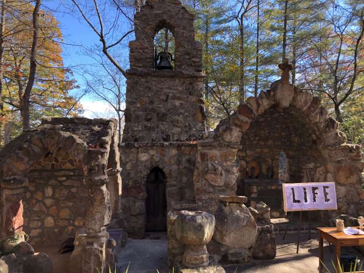 November 6: I leaned forward at such an angle that an observer would have imagined a defiant headwind. Except all possible observers from the retreat leaned the same way, hiking with me up the mountain along Cross Trail. At last we reached our destination: an observation platform and four flights of wooden steps without risers or sides. And I’m terrified of heights. But I’d come so far. Up, up I went, clutching the handrails and denying the ground below. I reached the top (which wasn’t really that high) and snatched my views. Then, backing away from the railing, I hugged the white column rising through the platform’s center. It soothed me and fortified me for the descent. When I touched down, I looked back up at the platform. Then I understood the name of the trail; the column that settled me was the upright of a cross.