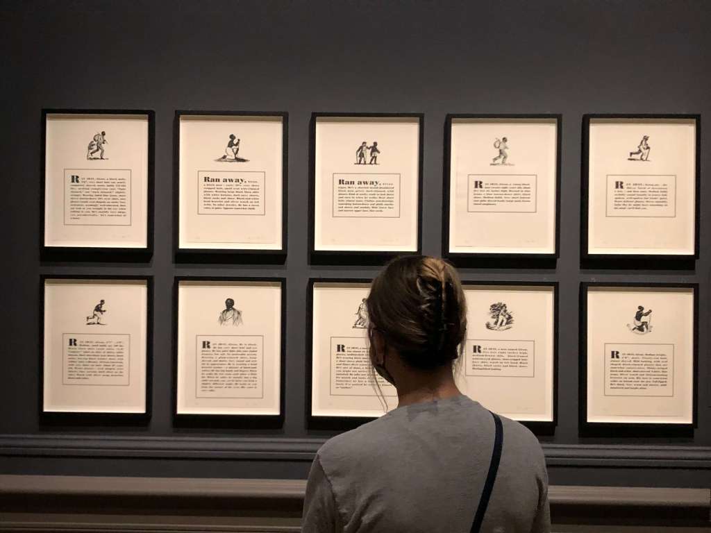 The one that captivated me, though, was a contemporary piece that wedded bitter history with wry humor. The artist, Glenn Ligon, reimagined handbills that had been used in the 19th century to find enslaved “Runaways,” as the piece is called. Each lithograph features a stock printer’s image and a description of the “runaway,” in this case the artist himself through the eyes of his friends. Ligon’s friends offer quirky descriptions and sometimes disagree about his height, build, coloring and even his personality. The context is grotesque — and the content is hilarious.