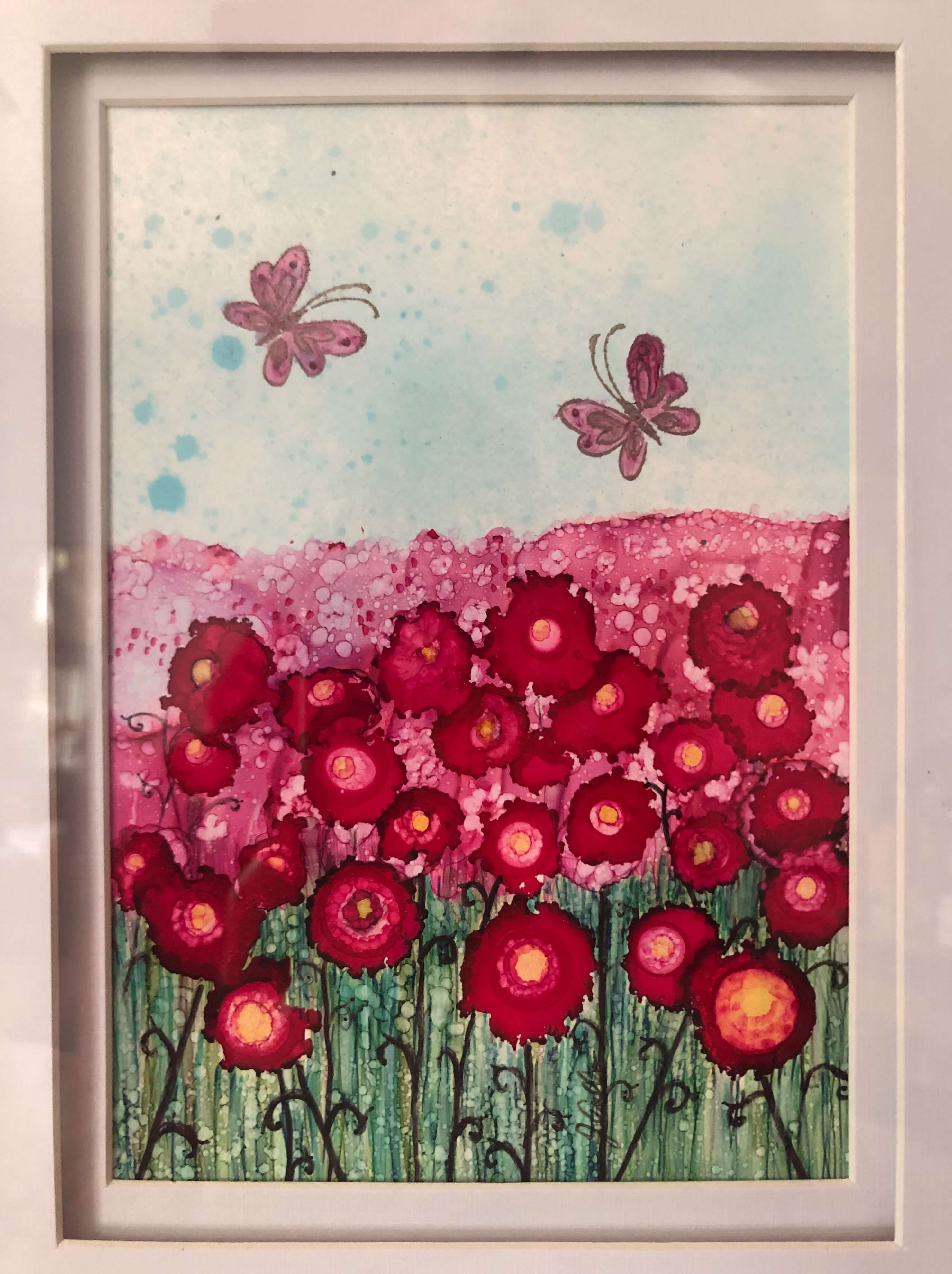 In Occoquan, I purchased this field of poppies from the artist. To obtain the vivid colors and movement, she used alcohol ink, a medium consisting solely of alcohol and pigment, with attributes changing based on the porous or non-porous surface employed. It makes me so happy.