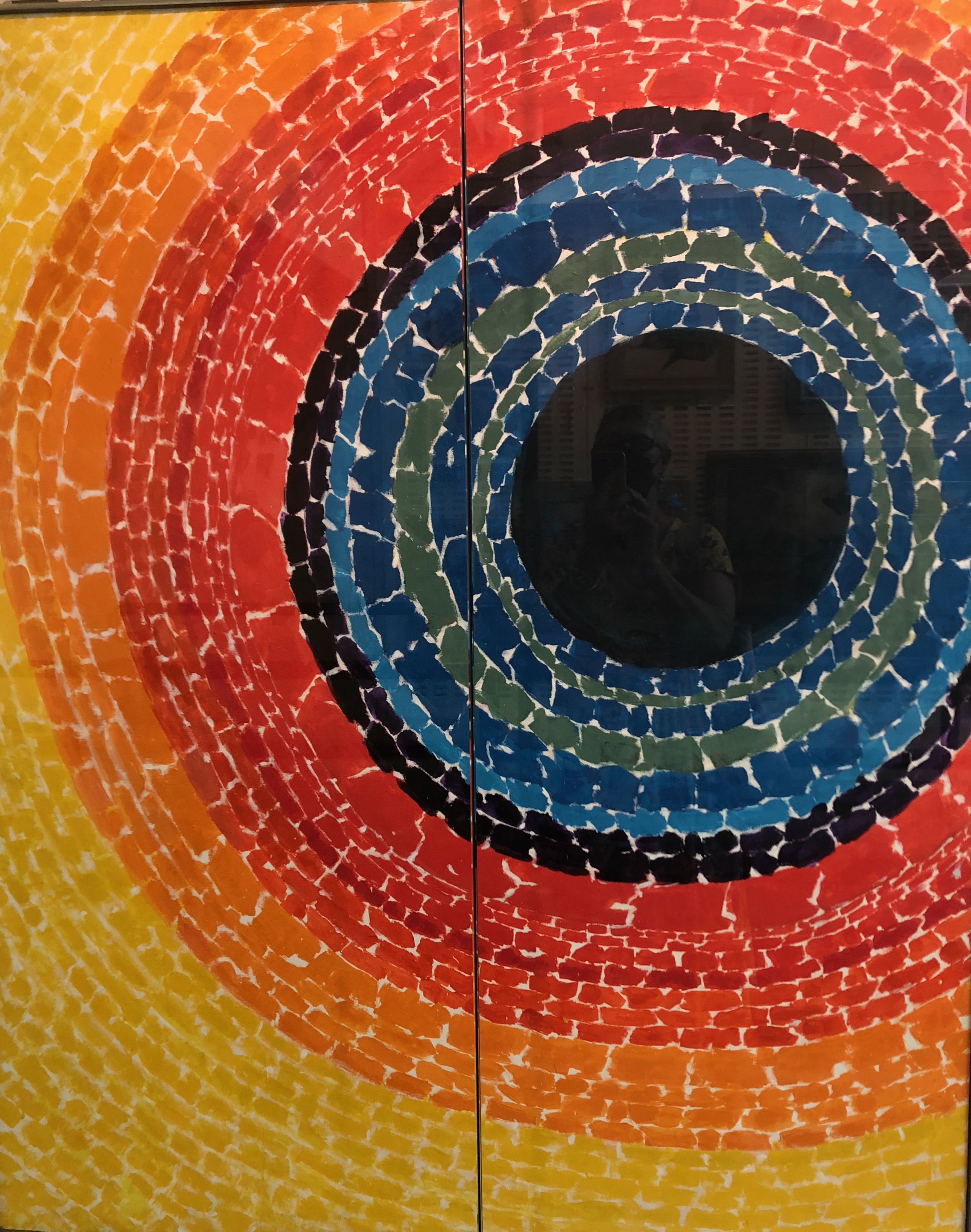 I’m about to mention Alma Thomas, so here’s the painting that inspired my umbrella. (Any excuse will do to feature an Alma Thomas painting.) This painting, The Eclipse, has a line running through it because I found it in a glass case in the storage area of the Smithsonian American Art Museum.