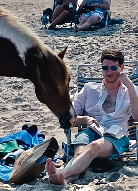 June 19: Engrossed in his book on a beautiful beach day, Jeremiah felt a looming presence. He turned to see a wild Assateague pony standing right next to him, snuffling through his bag. Jeremiah kept perfectly still while the pony nudged his face. Eventually, the pony wandered away. But she left quite an impression.