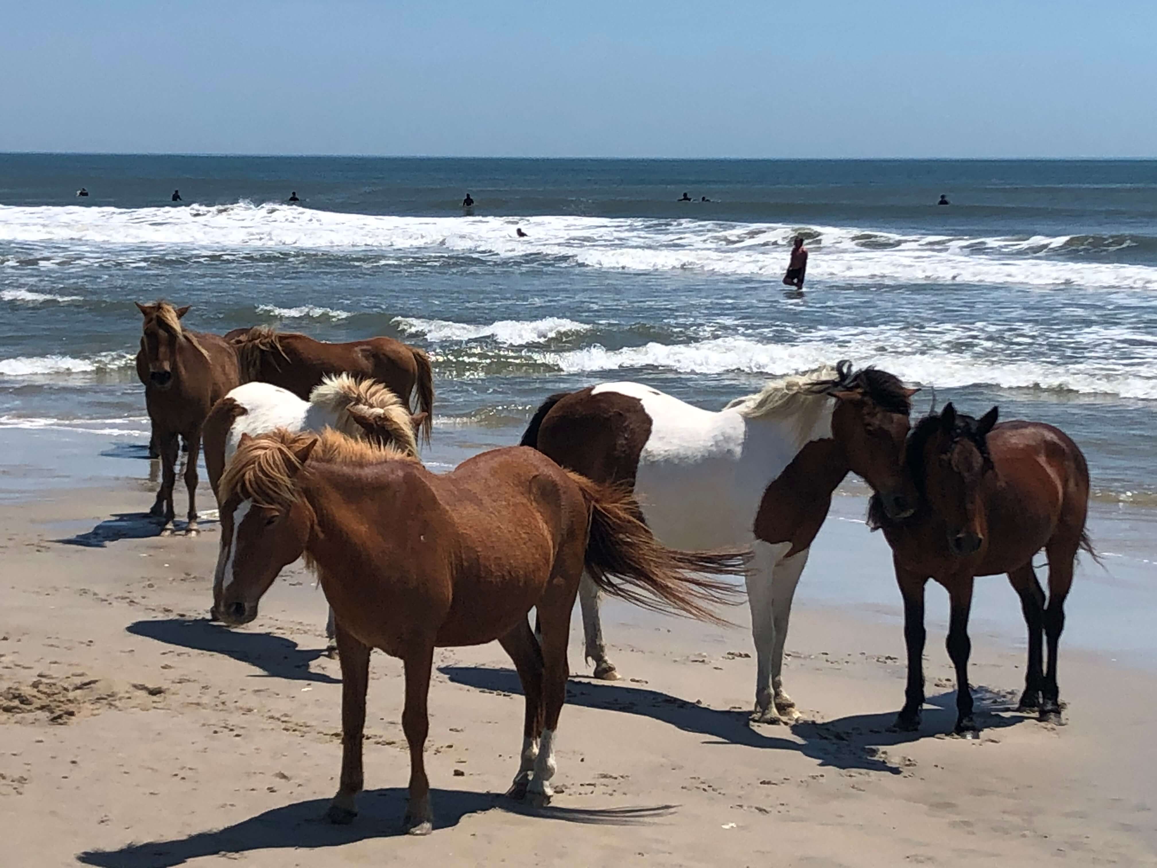 Bonus: My friend eased our car through the Assateague welcome gate and surveyed the parking lot. We had arrived fairly early in the morning, so parked cars were few. Abundant, however, were the ponies (at least twelve) clustered near one of the parking lot entrances and spilling into the road. Which beach today? The simplest reply: “This one. Just turn left at the horse.”