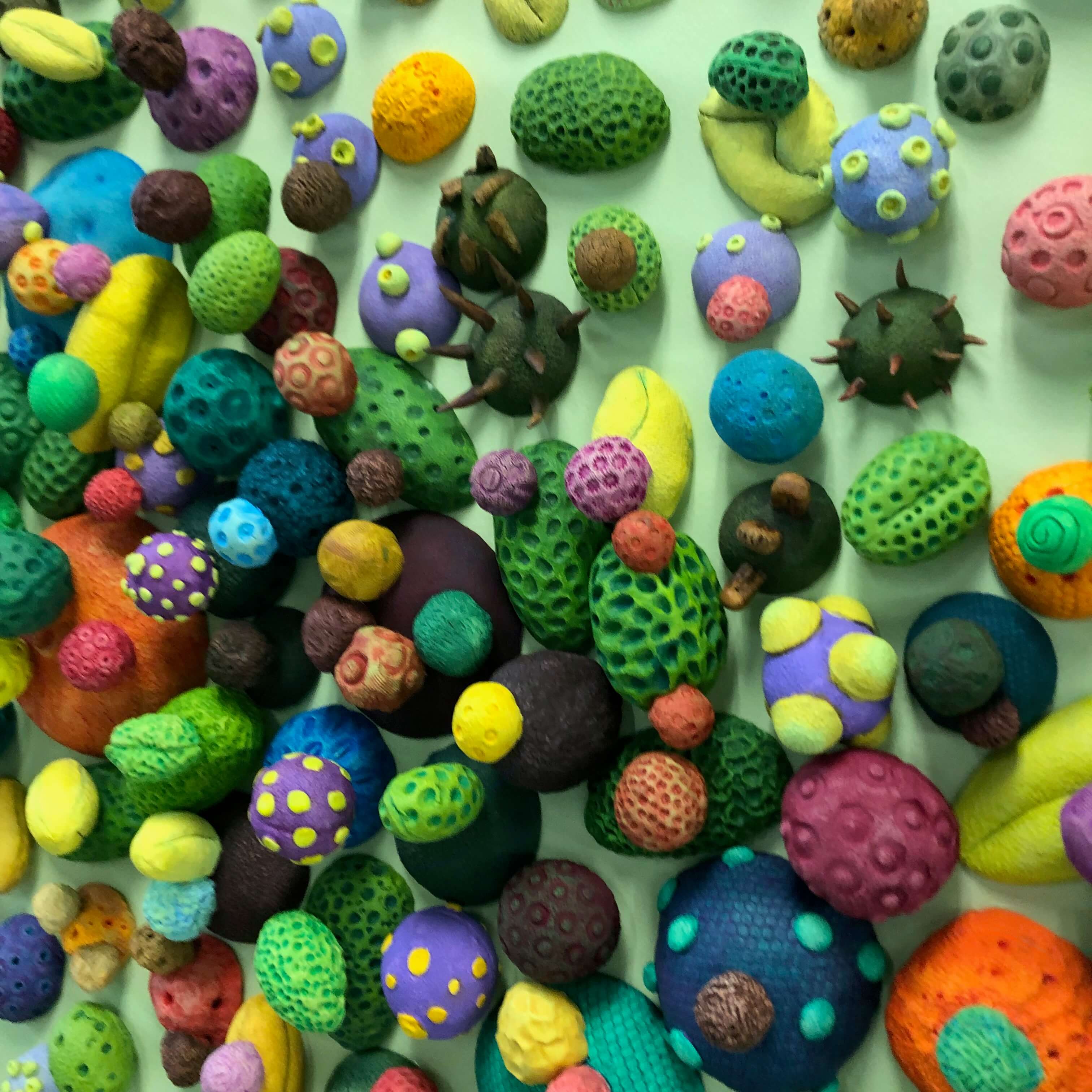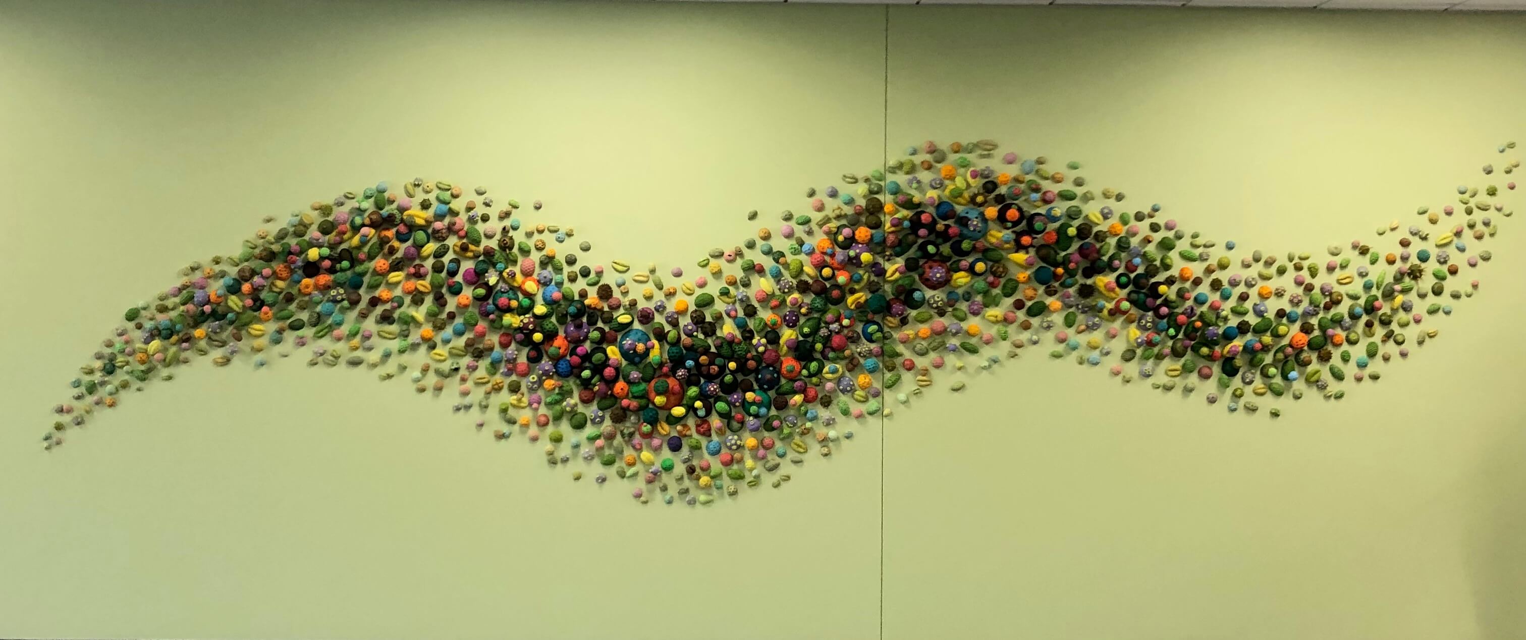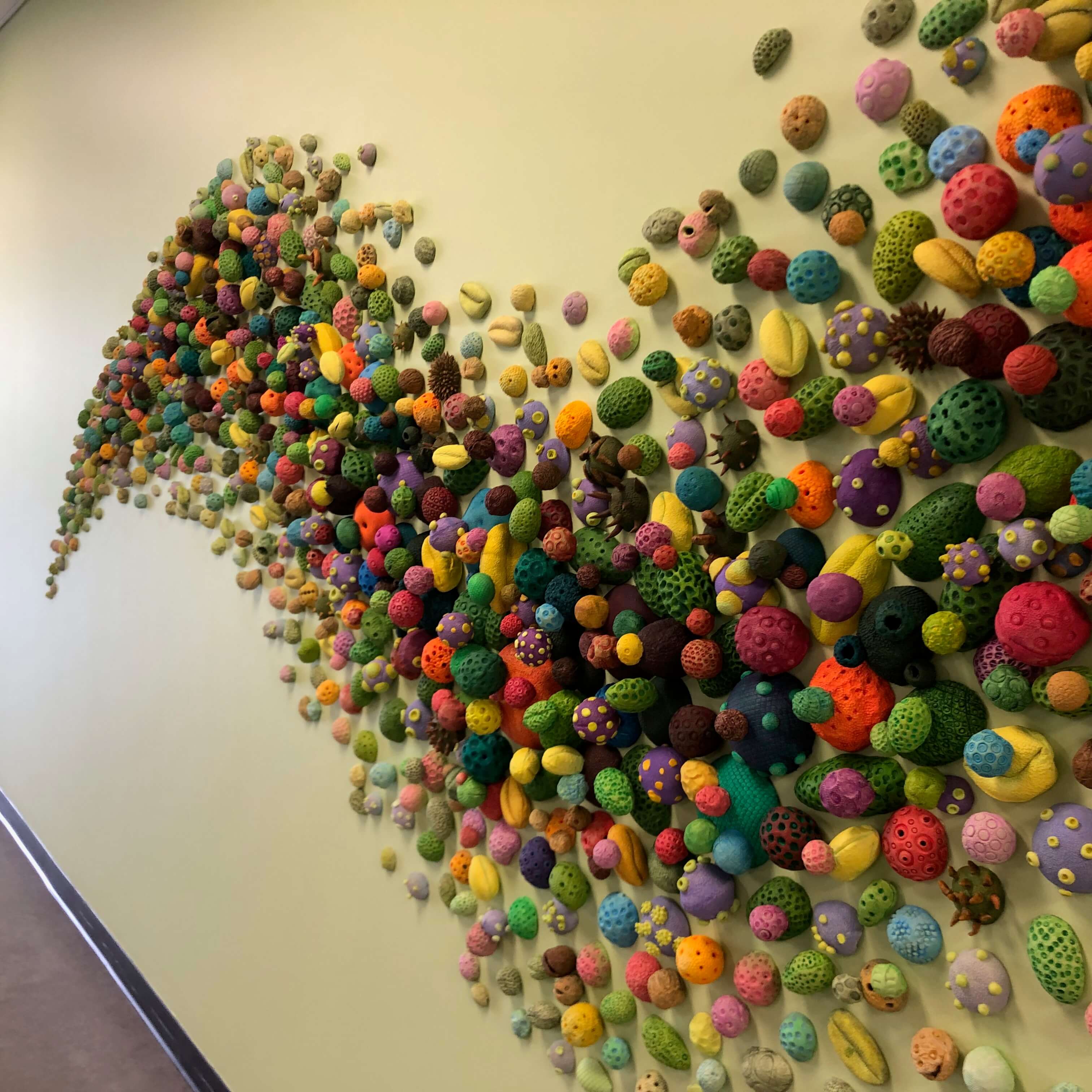 Bonus: Our high school has welcomed its first Artist in Residence, who we all knew and loved from his decades as an elementary and high school art teacher. At today’s Convocation, we admired his first commissioned piece, which is composed of ceramic seeds, pods and spores crafted by each student in the high school. The work evokes “The Great Scarf of Birds,” as John Updike said, that starlings create as they swoop and swirl across the sky: a murmuration, or a “liquid” whole composed of unique but integrated parts.