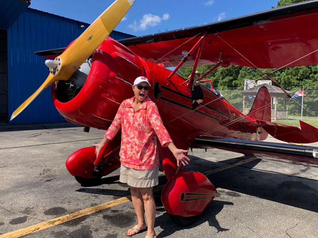 September 2: Next to the marsh and bay and island – and behind a chain link fence – rested a shiny red biplane. I was angling my camera down, up and sideways to snap a photo when a voice called out, “Do you want to come in?”