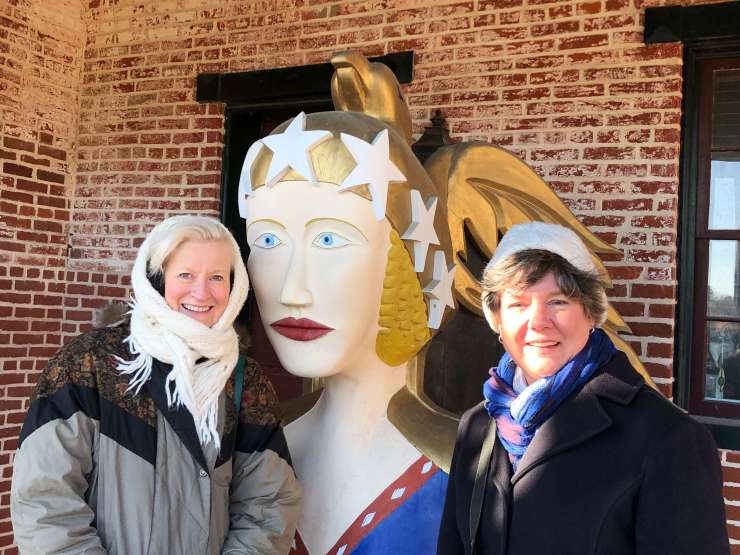 Cindy and Kathy shiver a few years ago in front of a ship figurehead in St. Michaels, Maryland.